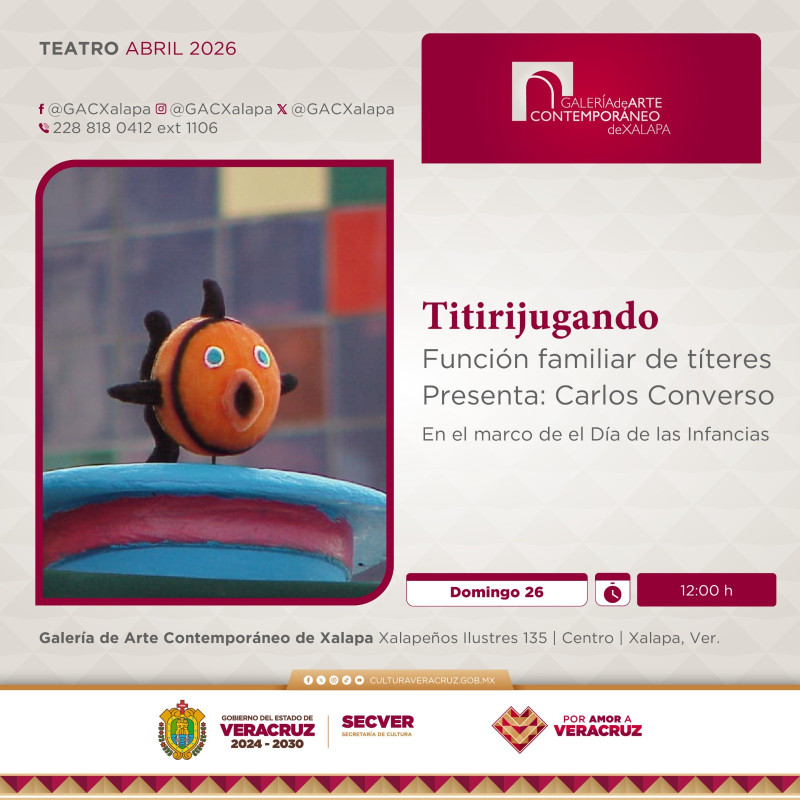 Xalapa, Ver.- En el marco de las celebraciones por el Día de las Infancias, la Secretaría de Cultura de Veracruz invita a la presentación de la obra teatral Titirijugando, del maestro Carlos Converso. La función se llevará a cabo el domingo 26 de abril a las 12:00 horas en la Galería de Arte Contemporáneo de Xalapa. La entrada es gratuita.