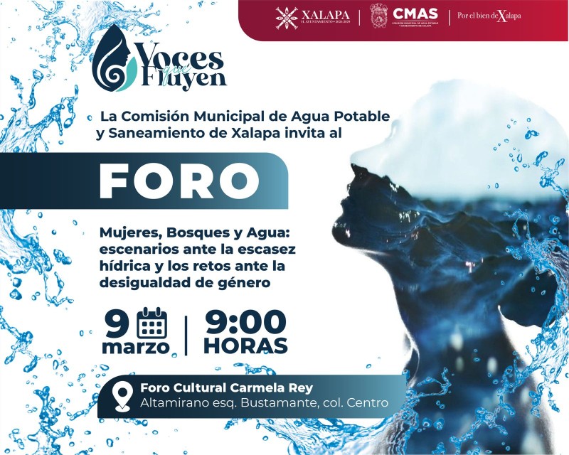 Xalapa, Ver.- Con el objetivo de abrir espacios de reflexión y diálogo sobre la relación entre el cuidado del agua, los ecosistemas forestales y la equidad de género, la Comisión Municipal de Agua Potable y Saneamiento (CMAS) realizará la Primera Jornada “Agua, Bosques y Género: Voces que Fluyen”.