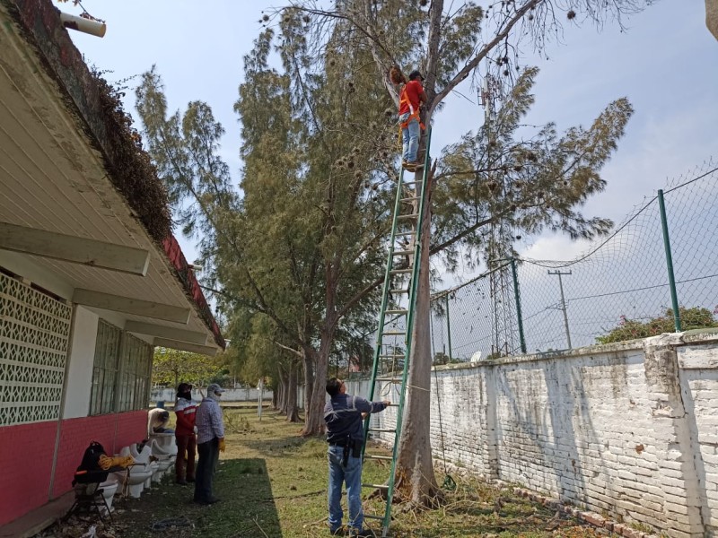 Avelino Vázquez Saldaña.- Con el objetivo de salvaguardar la seguridad de estudiantes, trabajadores al servicio del ayuntamiento acudieron a una institución educativa para realizar el corte preventivos de un pinos que se encontraban en riesgo de derribarse y que podían representar un peligro para los alumnos y el personal docente.